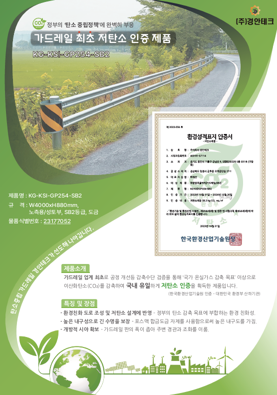 경안테크 철제가드레일 KG-KSI-GP254-SB2(도금) 제품이 저탄소제품 인증을 받았습니다.